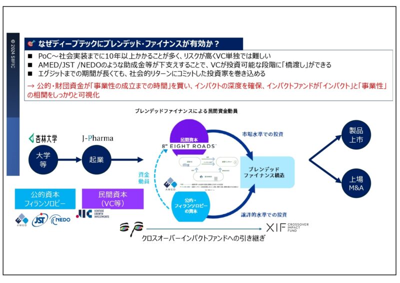 ディープテックには、実証実験から社会実装までに10年以上もの時間を要するという特徴があり、これを単一のファンドで支えるのは難しい以上、例えば医療であれば製薬会社の財団やフィランソロピー(社会貢献)活動の基金、AMED(国立研究開発法人 日本医療研究開発機構)JST(国立研究開発法人 科学技術振興機構)NEDO(国立研究開発法人 新エネルギー・産業技術総合開発機構)などの助成金が下支えし、それをベンチャーキャピタル(VC)が投資可能な段階まで橋渡しを行い、投資家を巻き込んでいくことで、長期的な支援とリターンが可能になります。