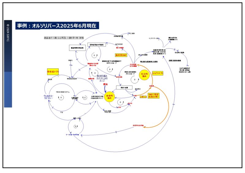 そこから、インパクトの特定評価手法について手探りするなかで行き着いたのがシステム思考です。例として、人工骨ベンチャーであるオルソリバースの製品が社会にどう影響するかを表したシステム図をご覧ください。